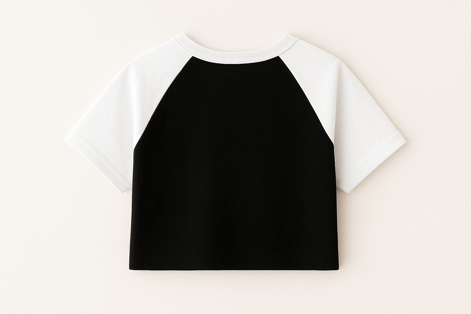 Level up your street style with this bold black-and-white raglan crop tee. Clean contrast, perfect fit, and made from soft cotton.